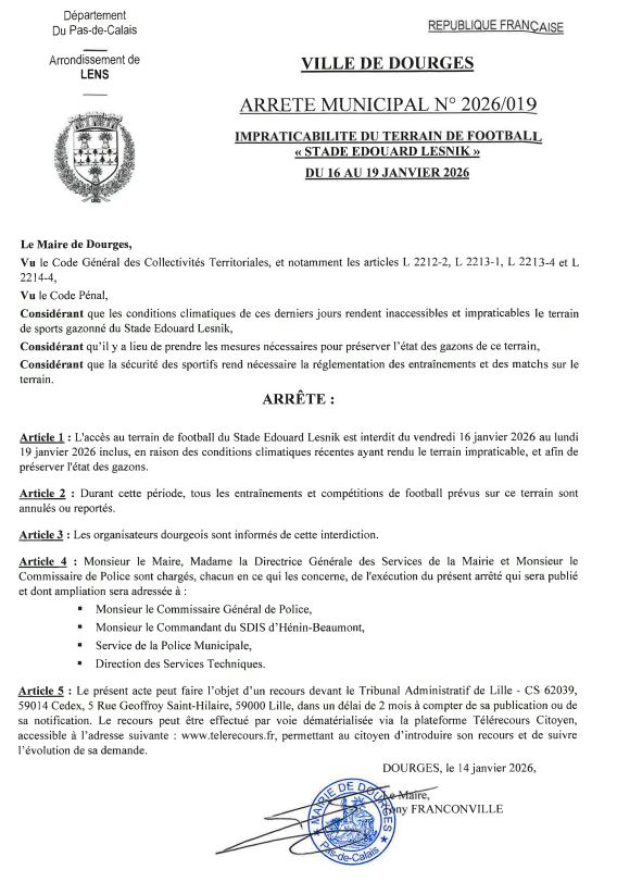 - Arrêté municipal N°2024-869 - Débit de boissons temporaire - Association "Roadrunners Flagfootball Team" - Tournée de la journée 2 de la ligue fermée des Hauts de france - Dimanche 1er décembre 2024 - Stade Lesnik (80Ko) publié le 27/11/2024 à 10:52